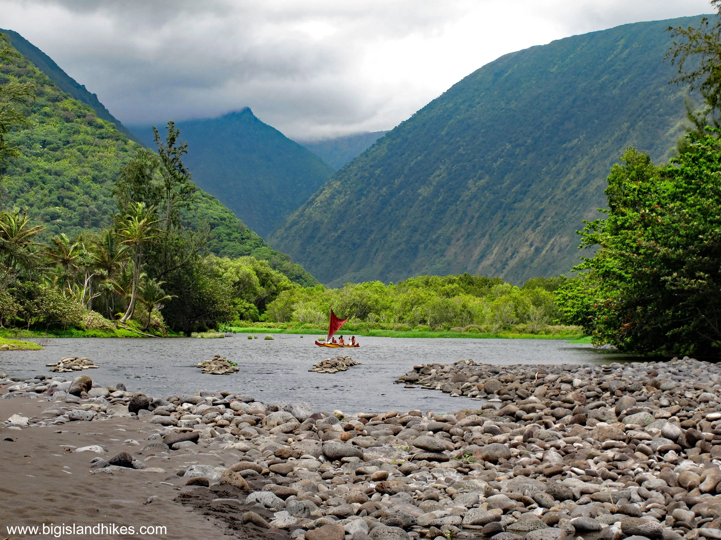 Trailhead: From Honoka’a in the northern part of the island, take Hwy. 240 west to Kukuihaele. The road comes to a dead end at the Waipi’o Overlook. Parking can be difficult at the small parking area. Take care to park in an appropriate place if you park up the road. This is the trailhead for two-wheel drive vehicles. There is a good overlook worth a stop near the parking area, although you can’t see much of the back of the valley. I don't recommend driving down into Waipi'o. The road is narrow, impossibly steep (25% average grade), and rough. It may be a violation of your rental car agreement. If you make it to the bottom in one piece, find an appropriate place to park and do not drive to the beach. A number of guiding services, shuttles, and horseback tours operate in Waipi’o and take also visitors down to the valley floor. Big Island Hikes does not review or endorse any commercial services.